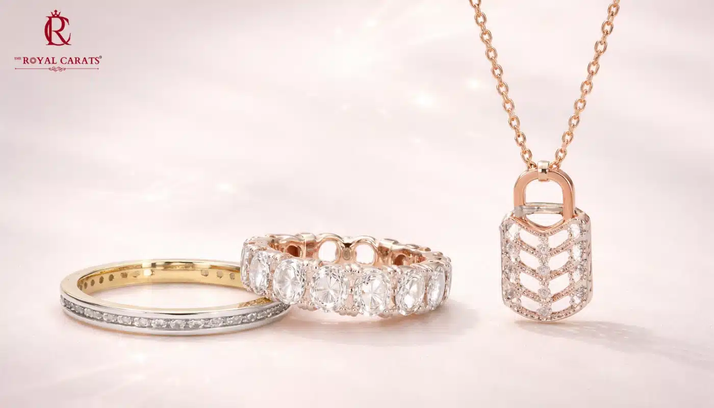 Elegant jewelry set featuring an eternity band, a slim stacking ring, and a padlock pendant necklace demonstrating how lab diamonds sparkle with brilliant fire.