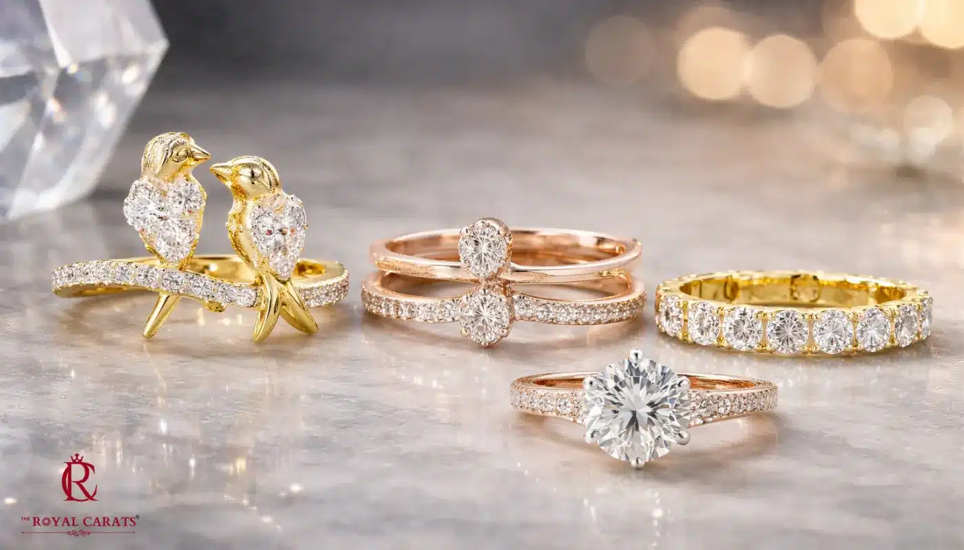 Four gold and rose gold rings showcasing how lab diamonds sparkle, including a unique double bird motif ring and a classic round cut solitaire ring.