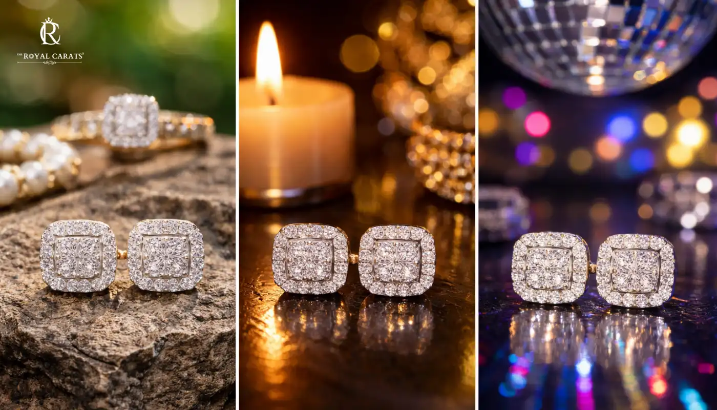 A side-by-side comparison of how square halo lab diamonds sparkle under natural daylight, warm candle light, and a colorful disco ball party setting.