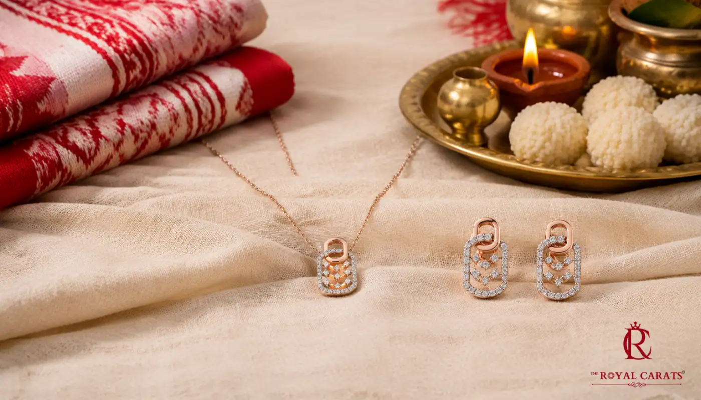Fashion studies show that over 65% of Bengali women in urban areas now prefer minimalist jewellery for religious and family events, choosing lightweight pieces they can wear all day. This shift has pushed brands to create finer diamond studs, delicate drop earrings, and subtle pendant sets that complement handloom fabrics rather than overpower them.