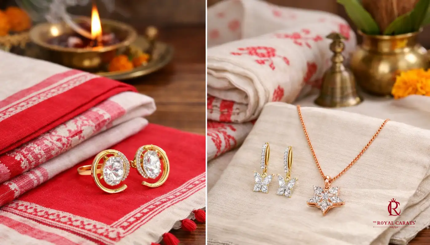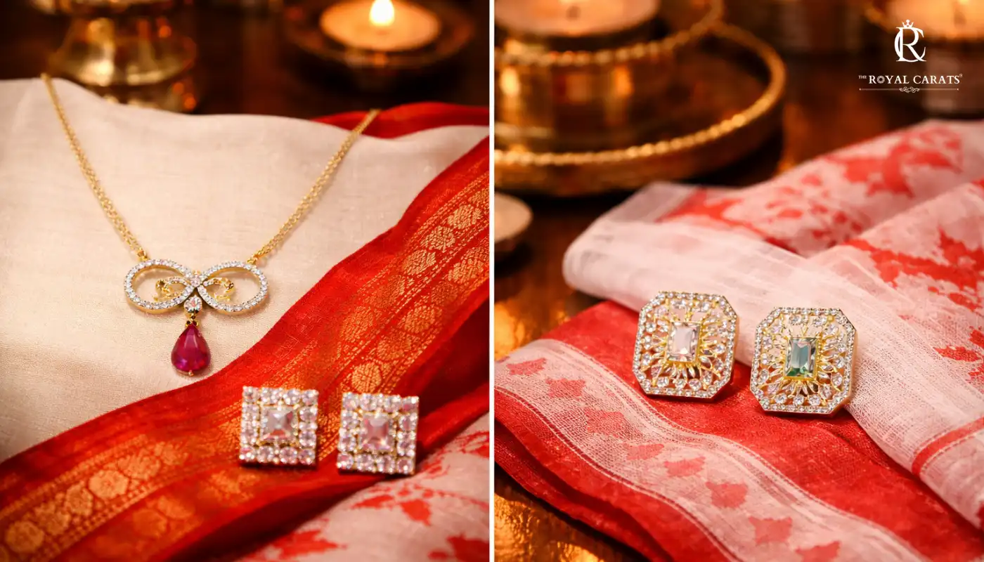 In this guide, you’ll discover how to pair minimalist diamond earrings from The The Royal Carats with traditional Tant and Jamdani sarees, and how to use pendant sets, rings, and hoops to complete your Poila Baisakh look.