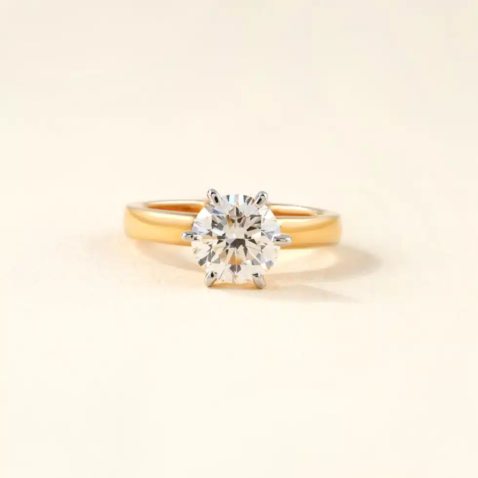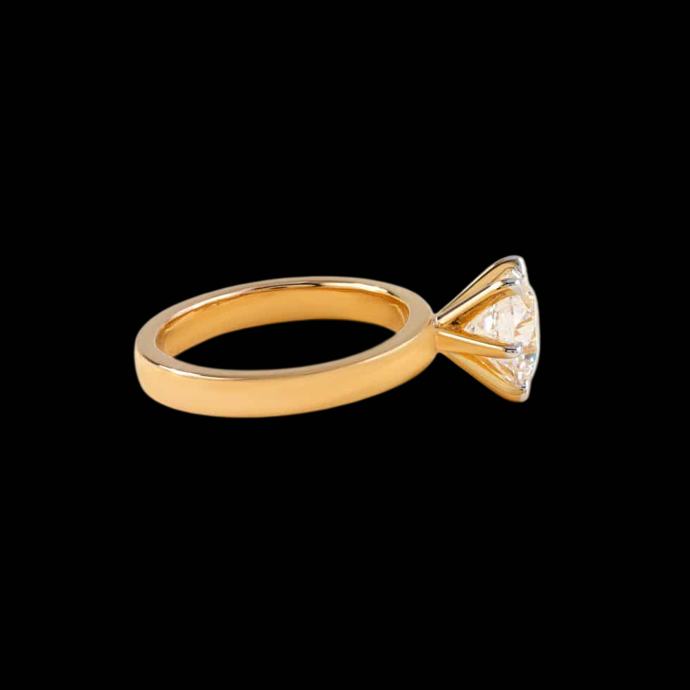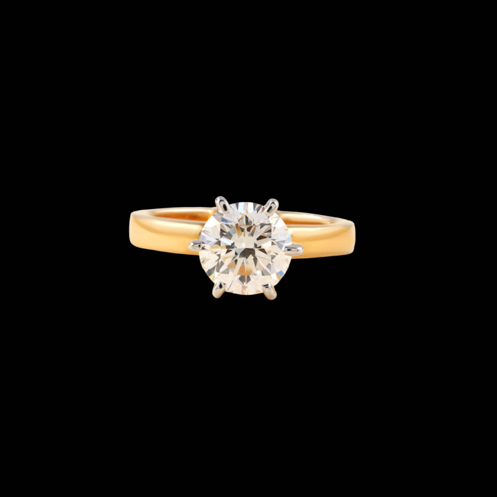 A timeless symbol of love and devotion—this elegant engagement ring features a dazzling round-cut diamond in a classic six-prong setting. With its sleek, polished band and radiant sparkle, it captures the essence of everlasting romance.