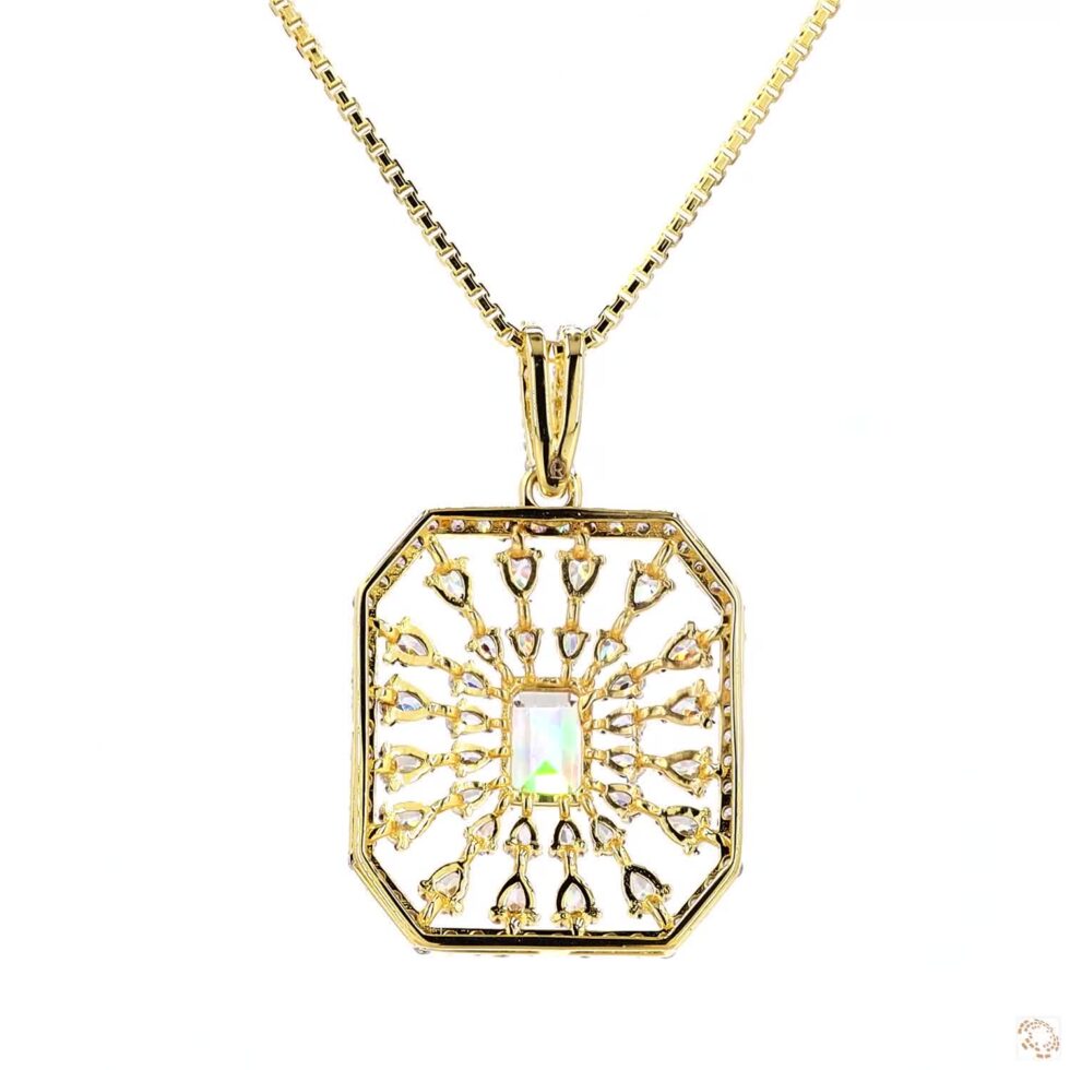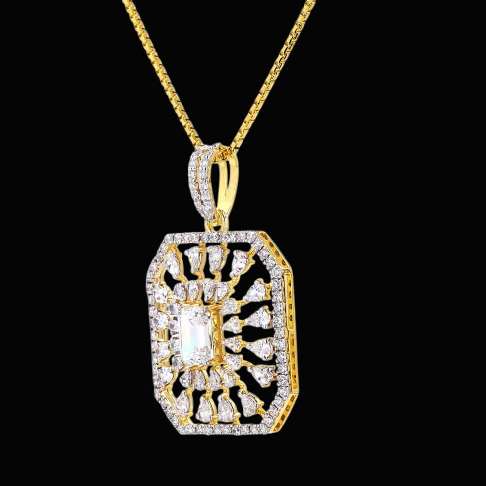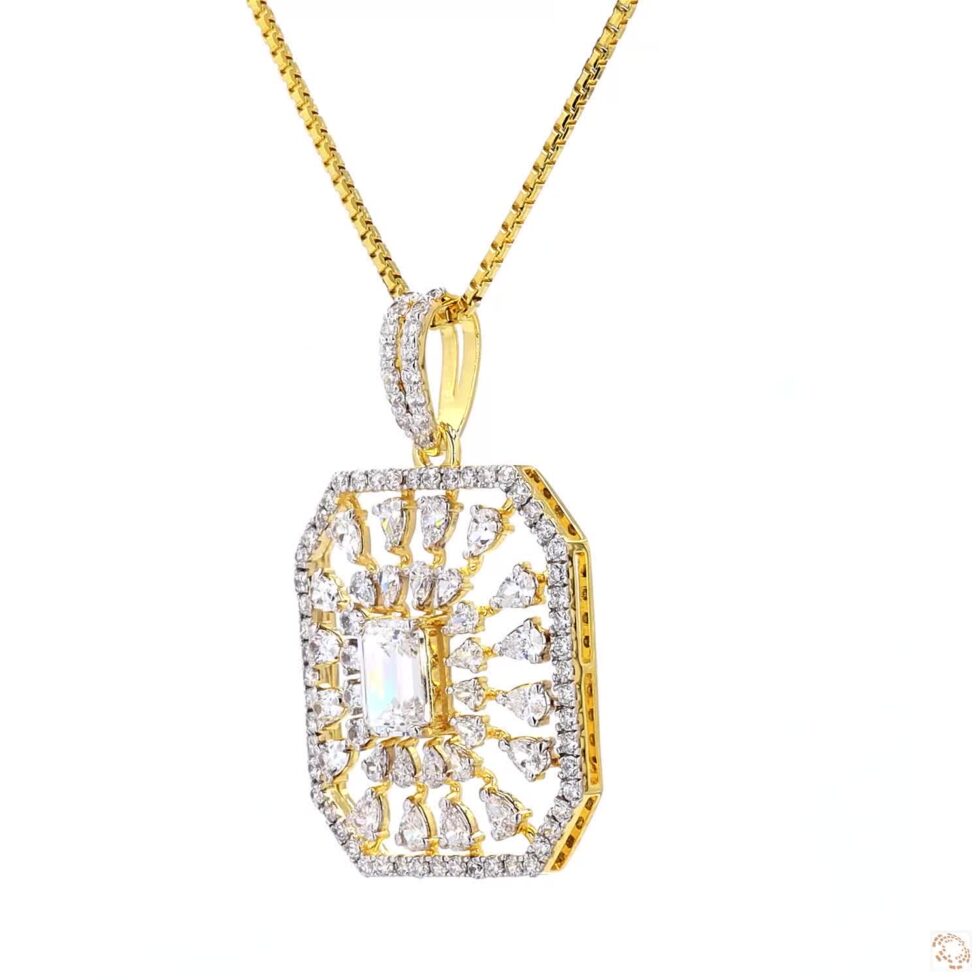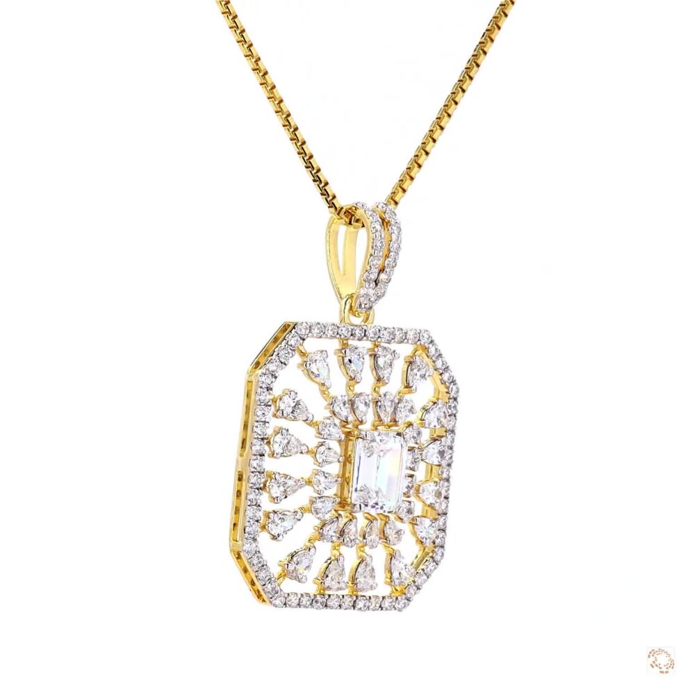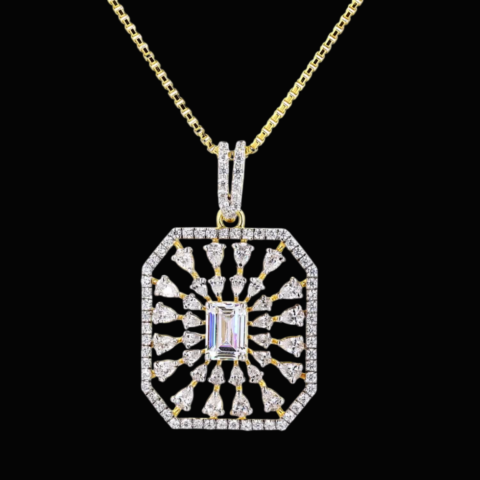 A delicate gold pendant radiates understated sophistication, gracefully suspended from a fine chain that enhances its luminous charm. At its center rests a single, captivating gemstone—brilliantly cut to catch the light with every movement. Its minimalist silhouette highlights the stone’s pure sparkle, creating a timeless expression of beauty and poise. Crafted with meticulous care, this classic pendant embodies the perfect balance of simplicity and luxury, making it an enduring symbol of elegance for any occasion.